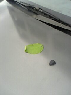 台風の名残。葉っぱが一枚僕の車にくっついてた。せっかくなんで、そのままにしてます。