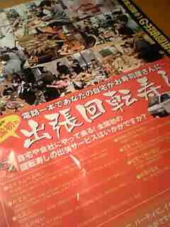 事務所のドアに挟んであったチラシに「出張回転寿し」の文字がっ!電話一本で来てくれるんだってさ。ヒジョーにひかれる!