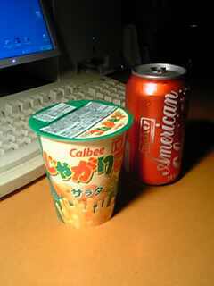 今日のおやつ。じゃがりこと、ゆめタウン50円コーラ。