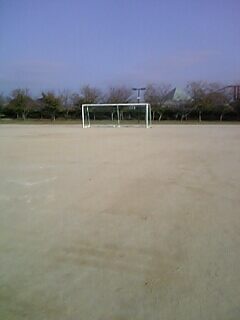 平日早朝の宗像ユリックスサッカーグラウンド。誰もいないから、コート一面使い放題。足がもつれて転んでも誰にも見られない。うう、ヒジ擦りむいて痛てぇ。