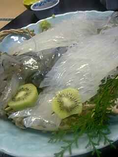 呼子でイカ食べてます。付け合わせのキウイが何故か存在感を示してます。